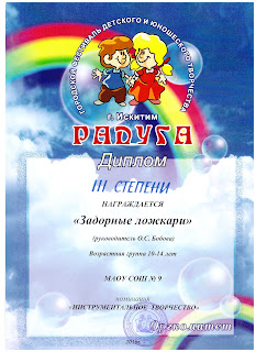 12 мая Завершился IX городской фестиваль-конкурс детского и юношеского творчества "Радуга".Танцевальный коллектив "Сюрприз" и инструментальный ансамбль "Задорные ложкари" приняли участие в честной творческой борьбе и стали ДИПЛОМАНТАМИ III СТЕПЕНИ. Поздравляем руководителей -Калиниченко Елену Сергеевну, Бобову Ольгу Сергеевну и их воспитанников с наградами!